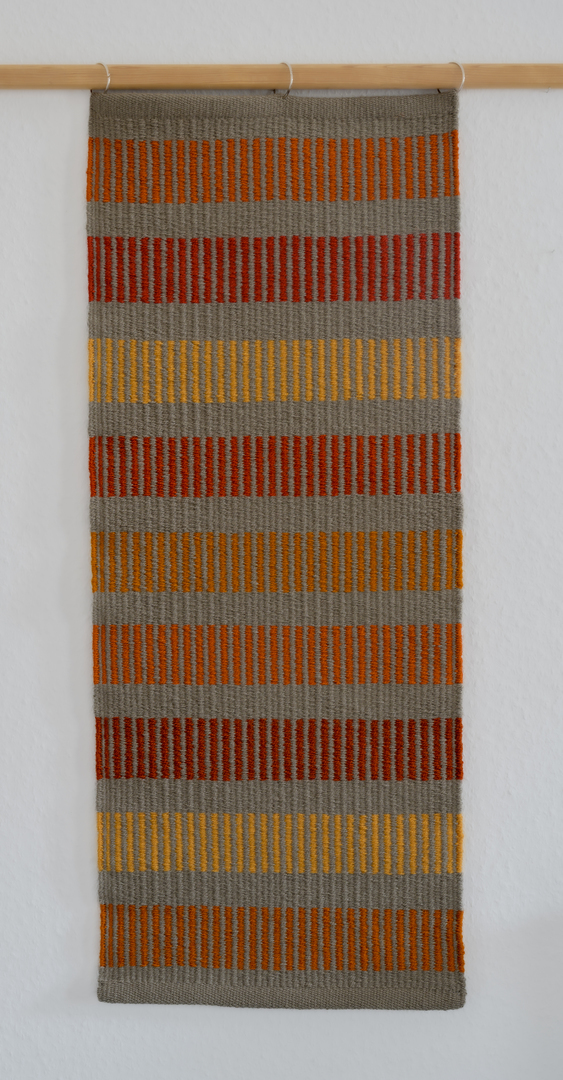 Bei der Gestaltung gehe ich von den klassischen Handwebbindungen Leinwandbindung und Köperbindung aus. Ich arbeite mit hochwertiger Norwegischer Teppichschurwolle mit einer großen Farbauswahl. Die Teppiche sind sehr strapazierfähig und für den Wohn- und Arbeitsbereich geeignet. Das Kettmaterial ist aus 100% Baumwolle.