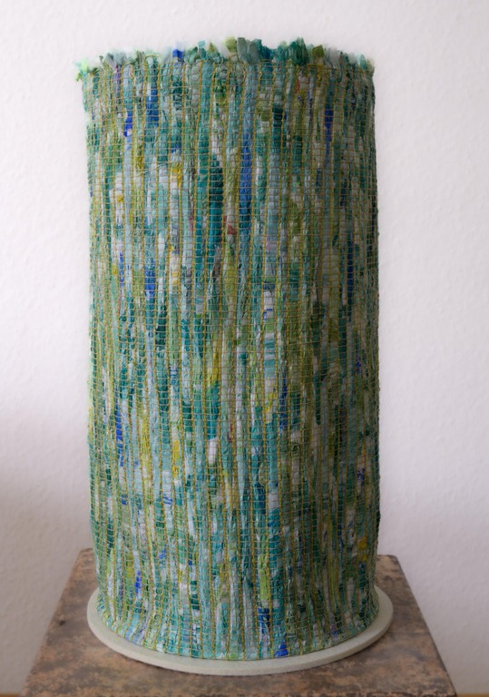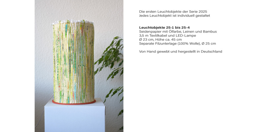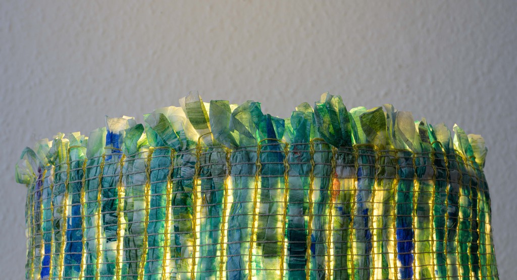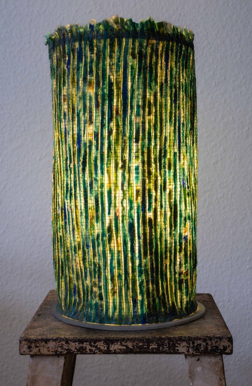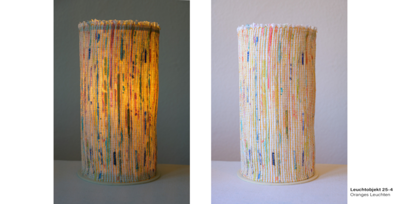 Die Leuchtobjekte sind mit Papierstreifen in verschiedensten Farbtönen gewebt. Jedes Objekt hat eine eigene Farbstimmung.