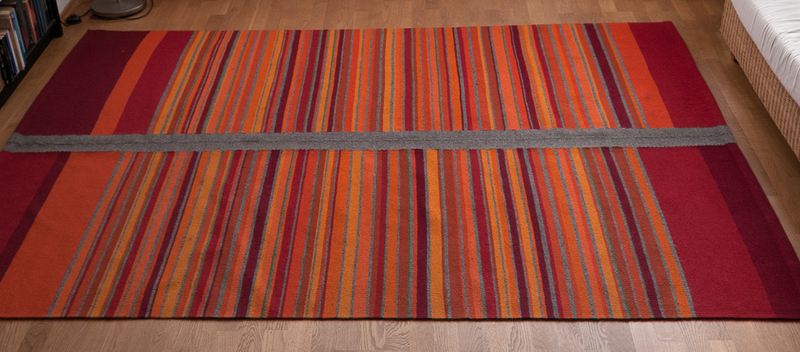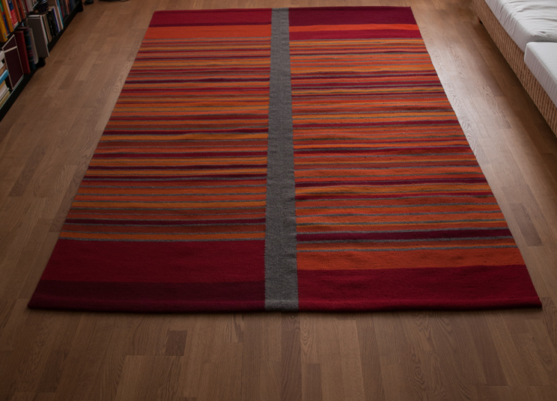 Der Teppich Streifen Duo besteht aus 2 einzel gewebten Bahnen, die in der Mitte aneinandergenäht sind. Die Verbindung der farbigen Streifen zum grauen Mittelstreifen sind in der Schlitzkelimtechnik gewebt.